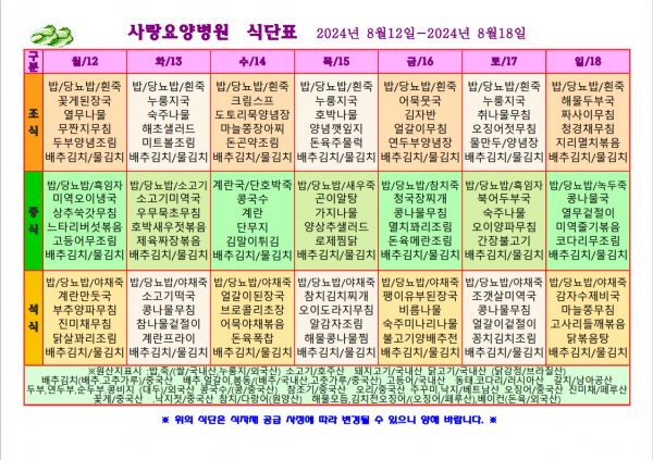 사랑요양병원 8월 셋째주 식단표