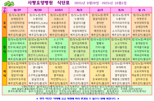 사랑요양병원 10월 첫째주 식단표