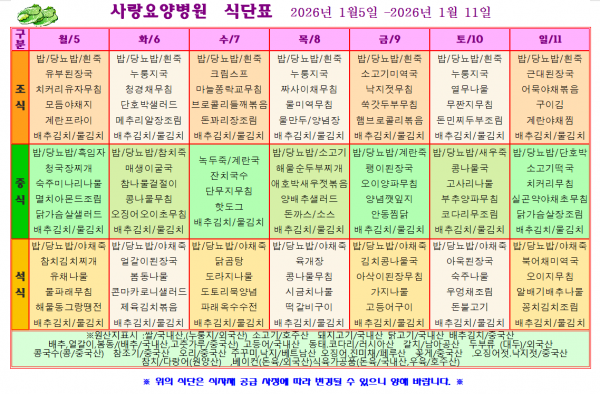 사랑요양병원 2026년 1월 첫째주 식단표