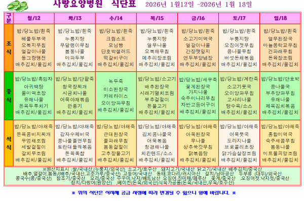 사랑요양병원 1월 둘째주 식단표
