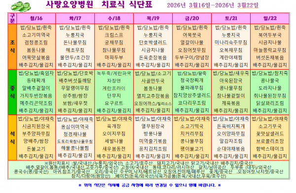 사랑요양병원 3월 셋째주 식단표