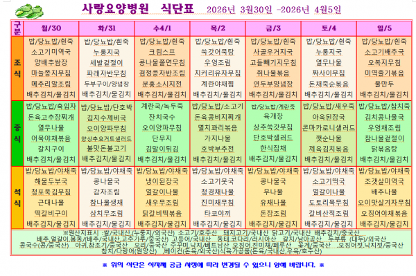 사랑요양병원 4월 첫째주 식단표